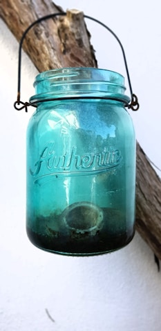 A blue glass jar with the word 'Authentic' embossed on its surface, hanging by a wire handle from a rustic wooden branch against a white wall. The jar has some dirt or debris at the bottom.